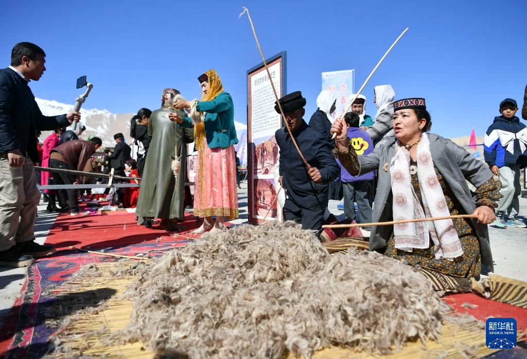 非遺傳承人在新疆塔什庫爾干塔吉克自治縣提孜那甫鄉賽馬場展示塔吉克族毛紡制作技藝(3月23日攝)。