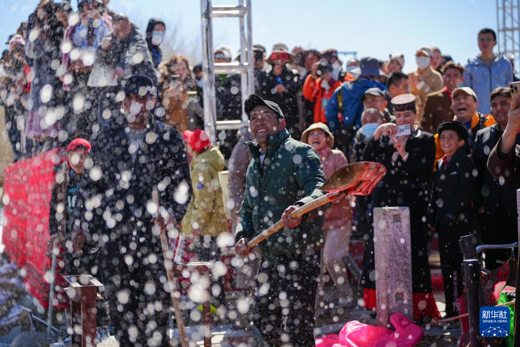 3月22日,在新疆塔什庫爾干塔吉克自治縣“彩云人家”民俗村,當地村民演示“破冰引水”非遺民俗后,將渠水潑向觀眾,表示祝福。