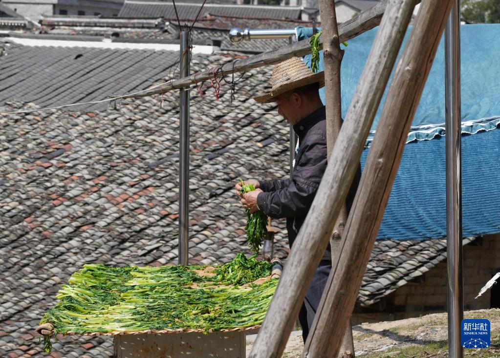 張谷英村村民在院落里晾曬蔬菜(3月21日攝)。