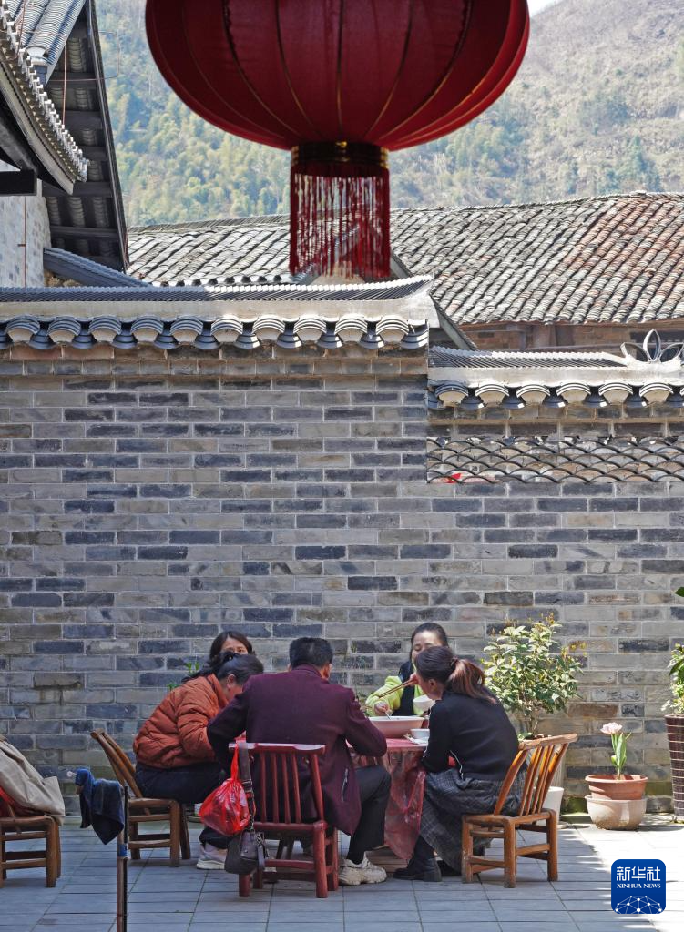 游人在張谷英村一家農家樂里吃午飯(3月21日攝)。