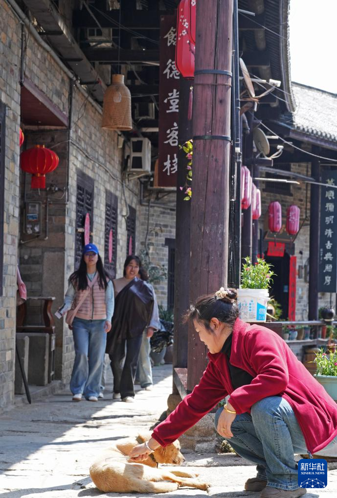 張谷英村村民在屋外給小狗梳理毛發(3月21日攝)。
