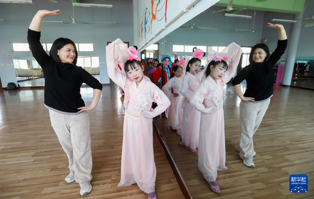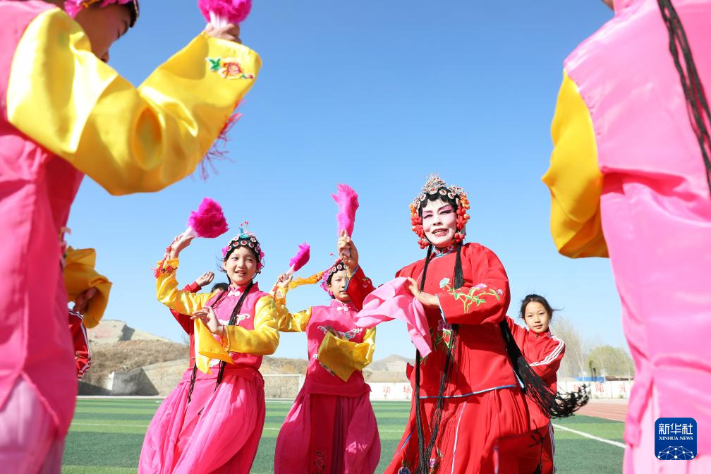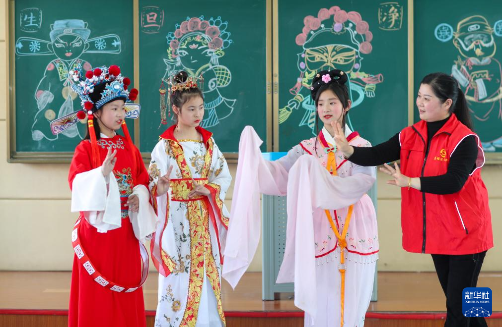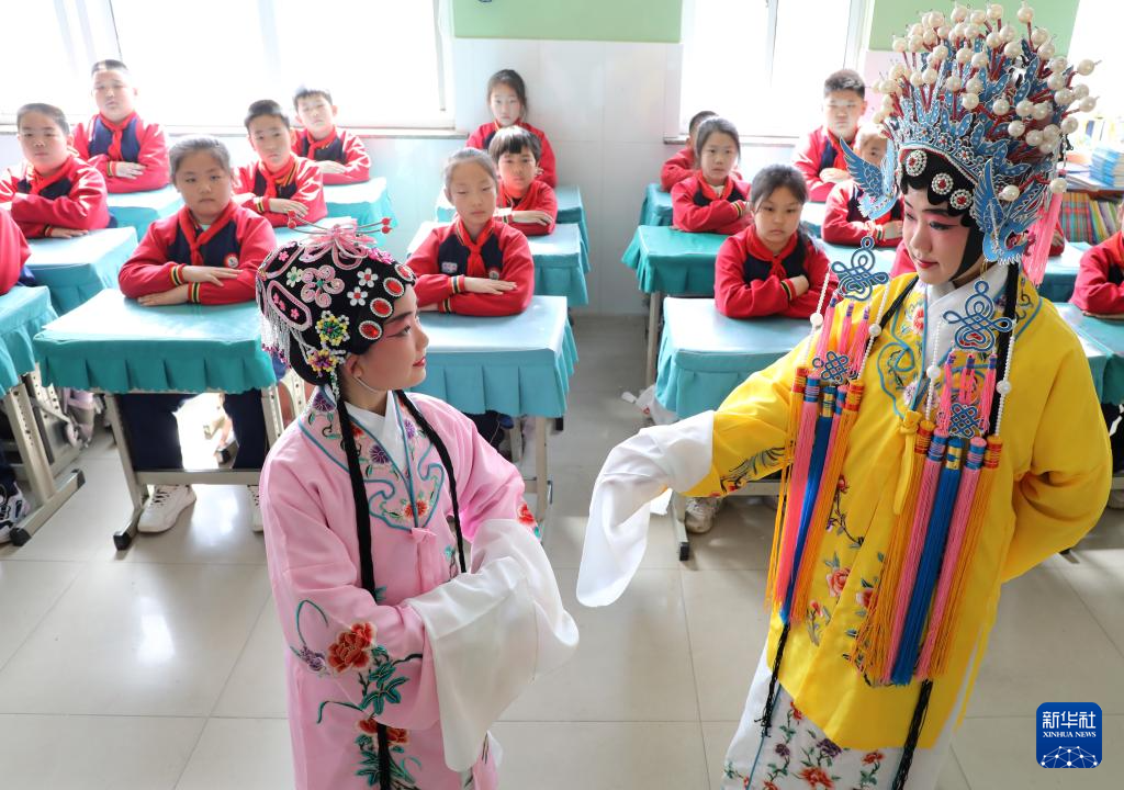 3月25日,在河北省唐山市豐潤區泉河頭鎮團山子小學,評劇演員在教學生戲曲動作。