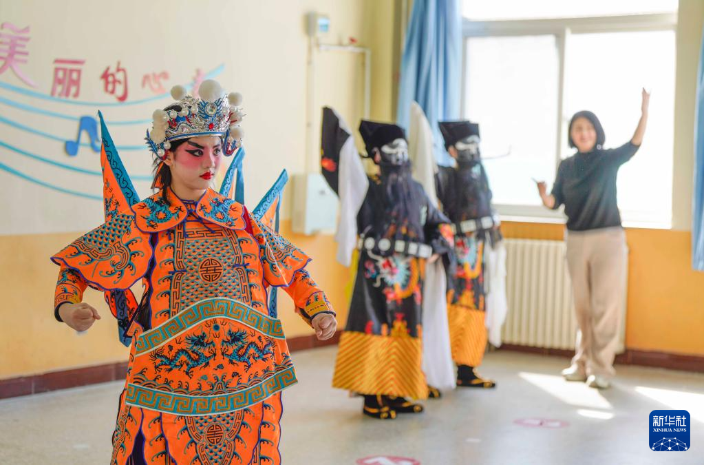 3月25日,河北省遵化市第四實驗小學戲劇社團的學生在排練京劇節目。