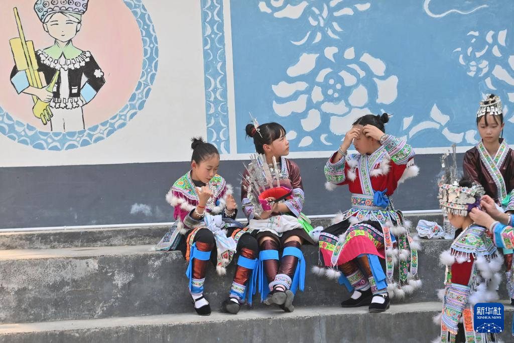 3月25日,柳州市融水苗族自治縣桿洞鄉中心小學學生進行演出前的準備。