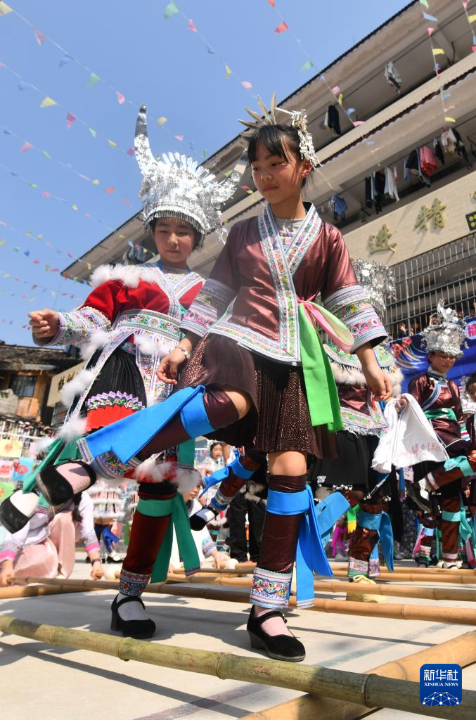 3月25日,柳州市融水苗族自治縣桿洞鄉中心小學學生在跳竹竿舞。