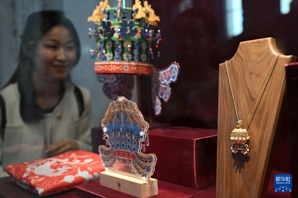 3月25日,觀眾在北京中國國家博物館選購鳳冠項鏈。