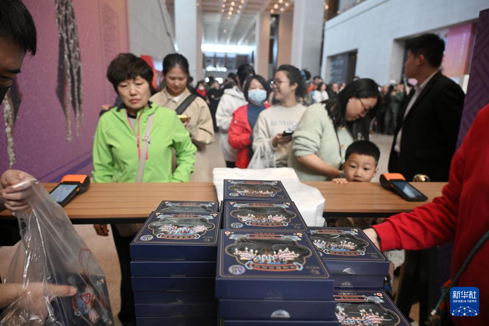 3月25日,觀眾在北京中國國家博物館排隊購買鳳冠冰箱貼。