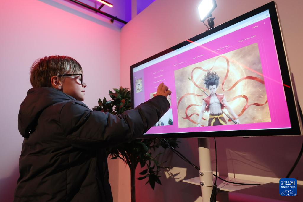 3月26日,在比利時布魯塞爾,小朋友在《哪吒之魔童鬧?!肥子郴顒由象w驗“哪吒”換臉游戲。