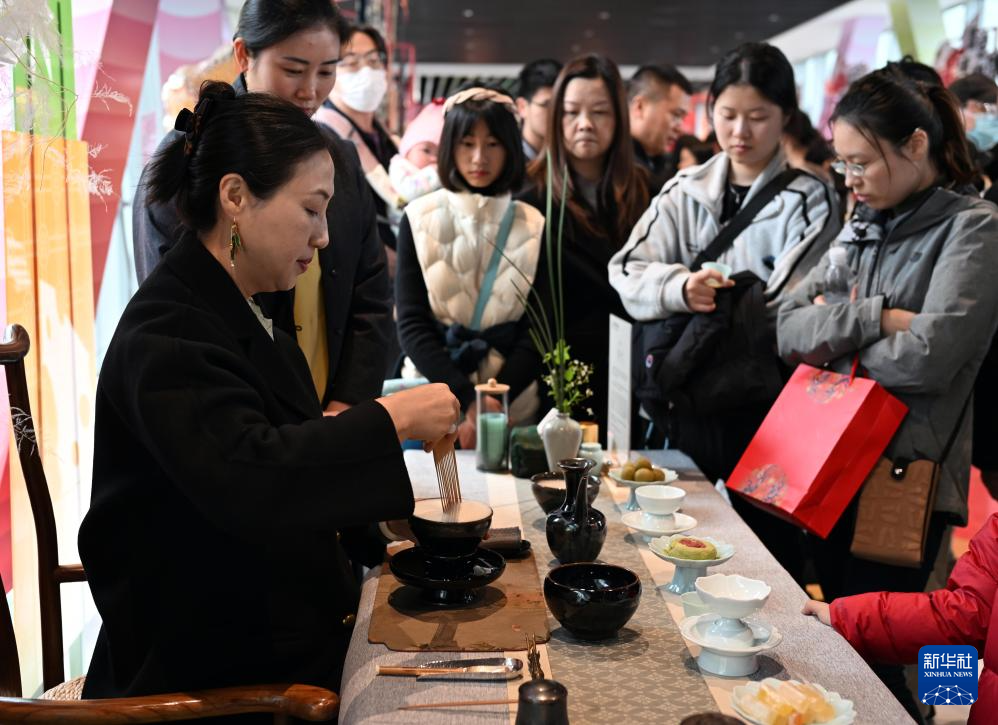 3月29日,在嘉亭薈舉行的文旅市集上,市民們欣賞傳統茶藝表演。