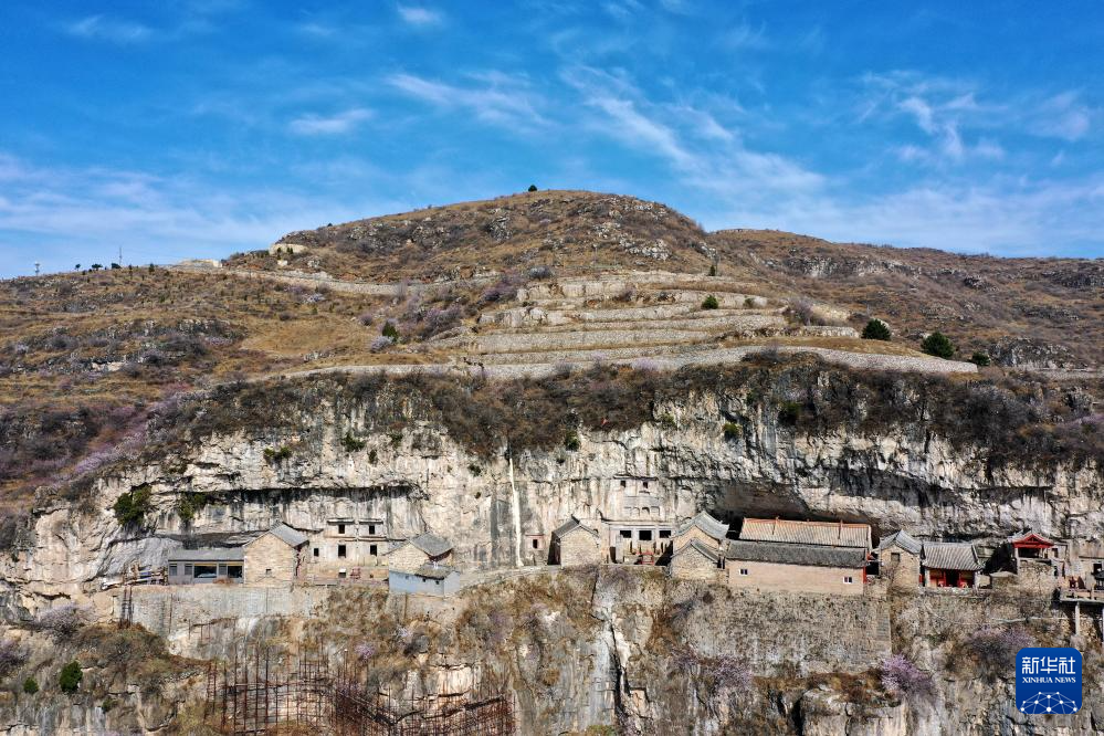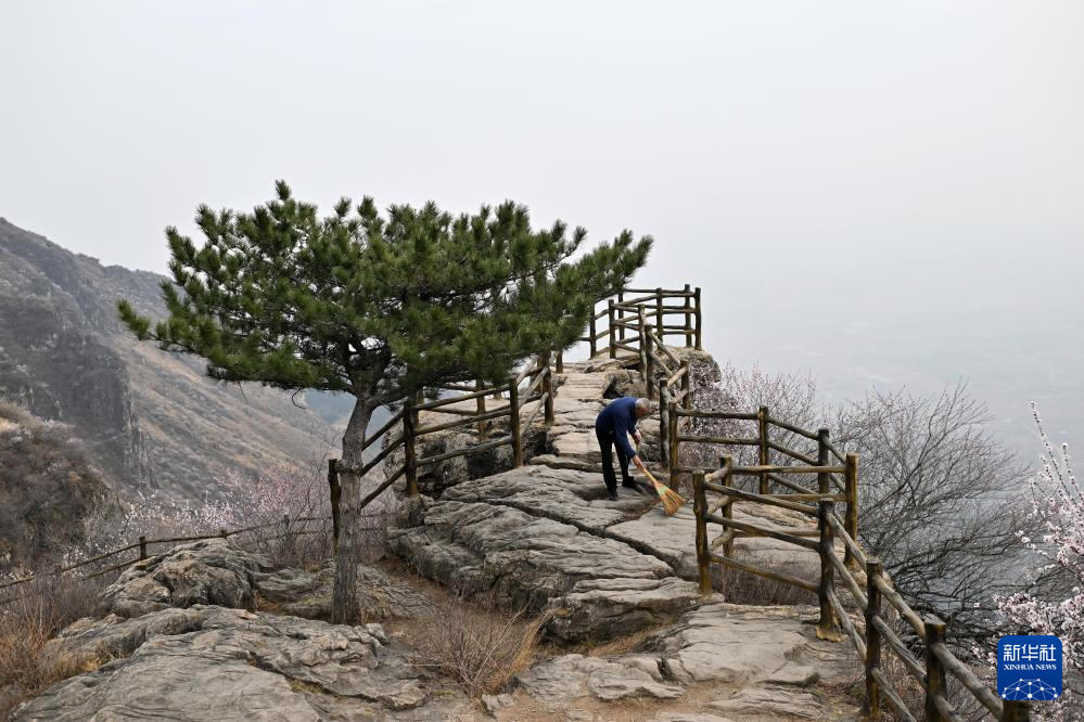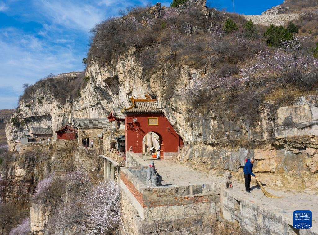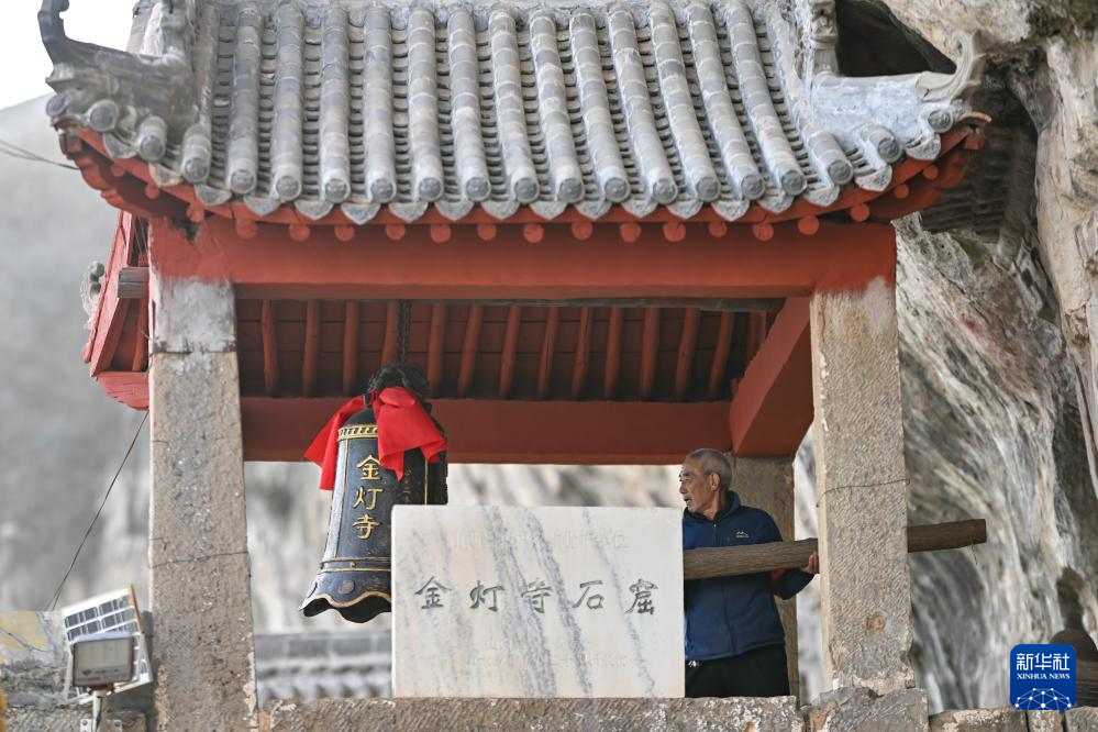 海拔1500多米的太行絕壁之上,山桃花掩映著歷經千年風霜的金燈寺。66歲的守寺人馮開平微彎著腰,輕輕擦拭著佛像上的塵埃。