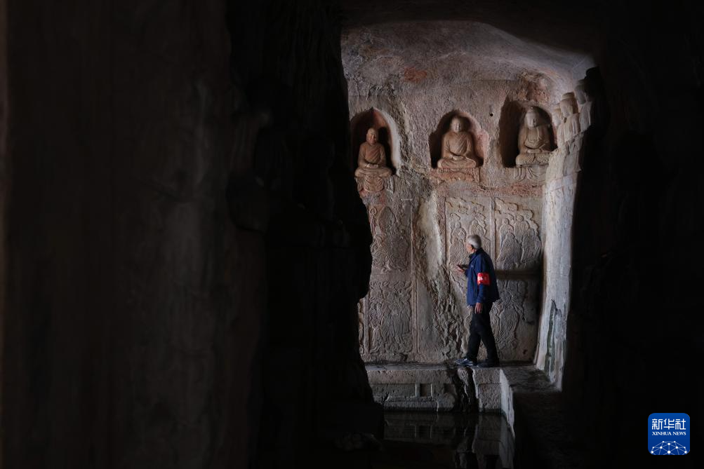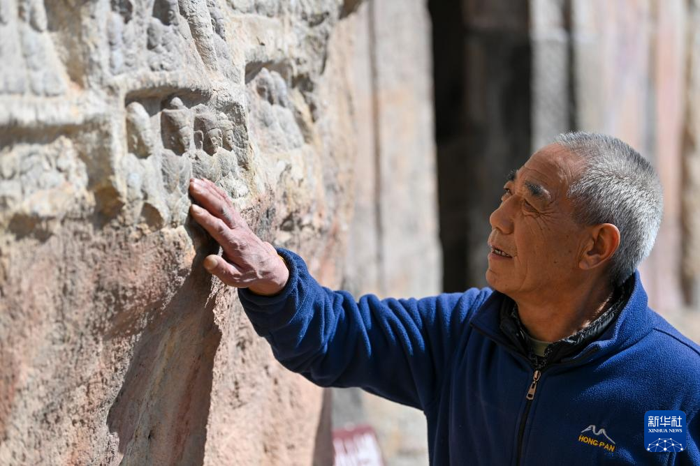 3月25日,馮開平在查看金燈寺水陸殿內的浮雕壁畫。