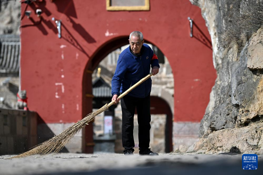 3月26日,馮開平在金燈寺外清掃地面(無人機照片)。
