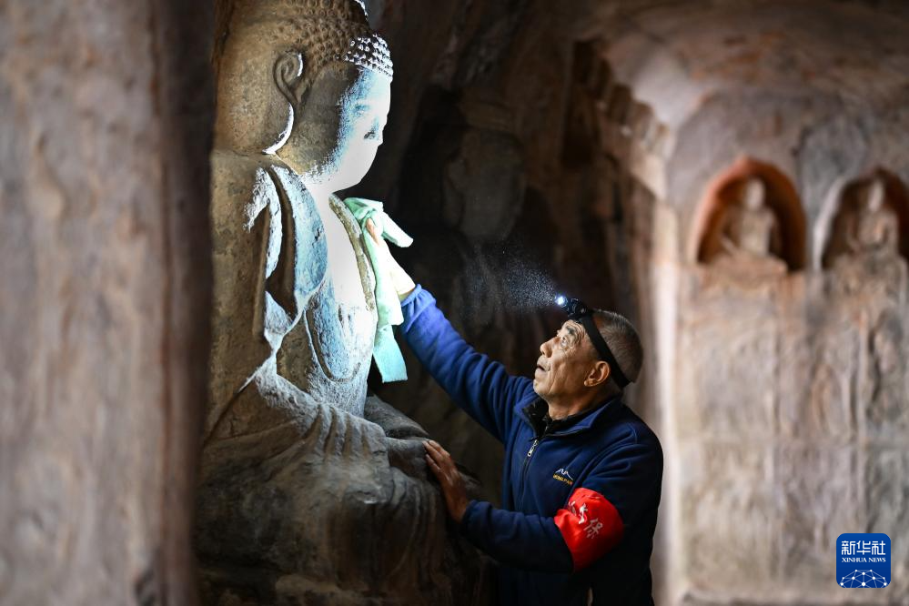 3月25日,馮開平在金燈寺水陸殿擦拭佛像。
