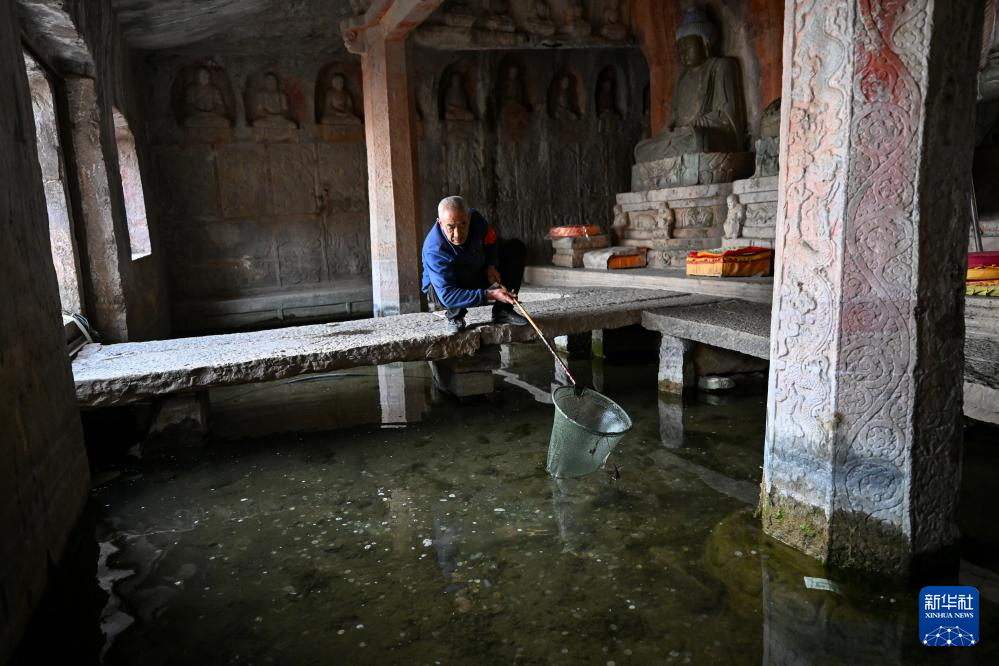 3月25日,馮開平在金燈寺水陸殿清理池水中的雜物。