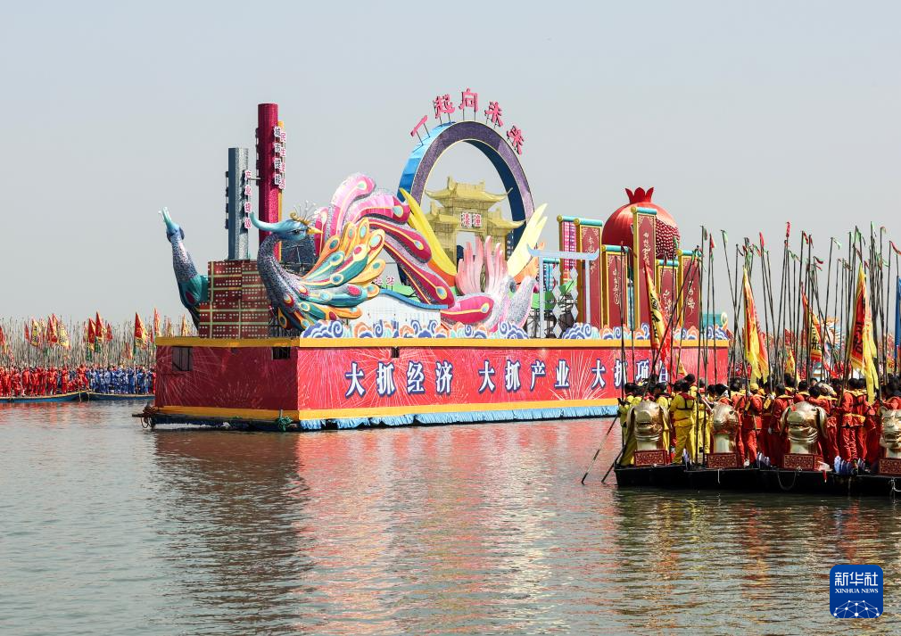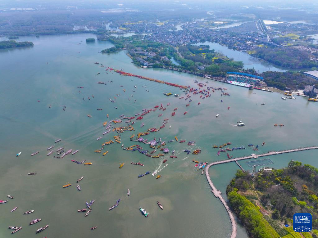 4月6日,龍船行駛在湖面上(無人機照片)。