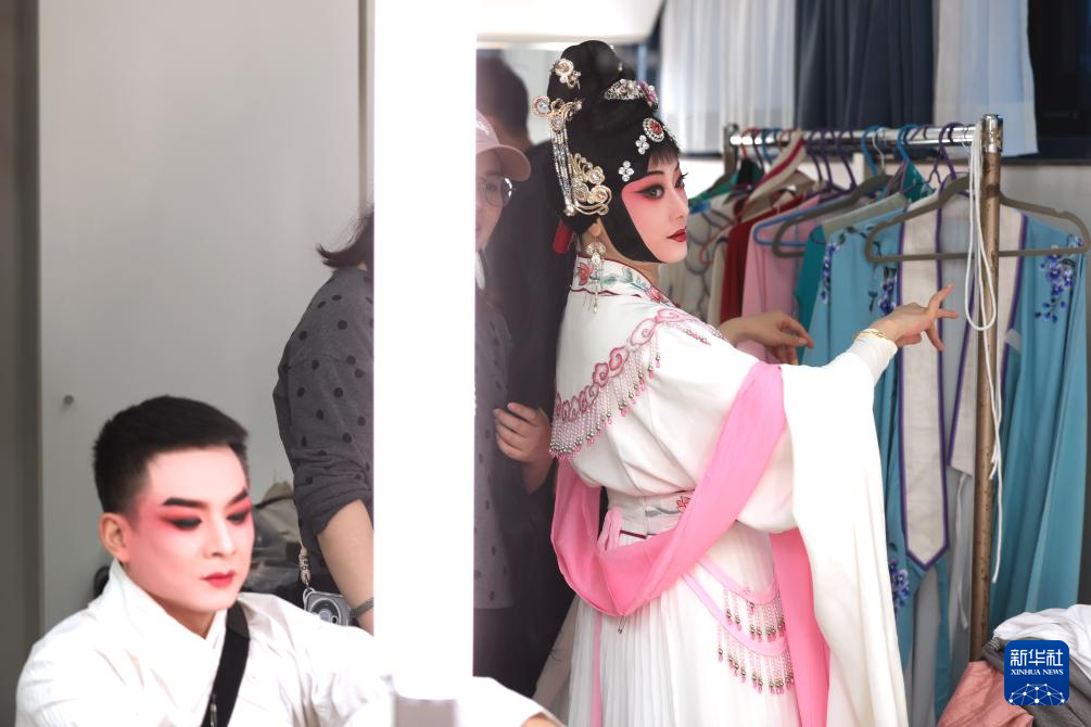 4月5日,在奧地利首都維也納,演員在婺劇《白蛇傳》演出前準備。