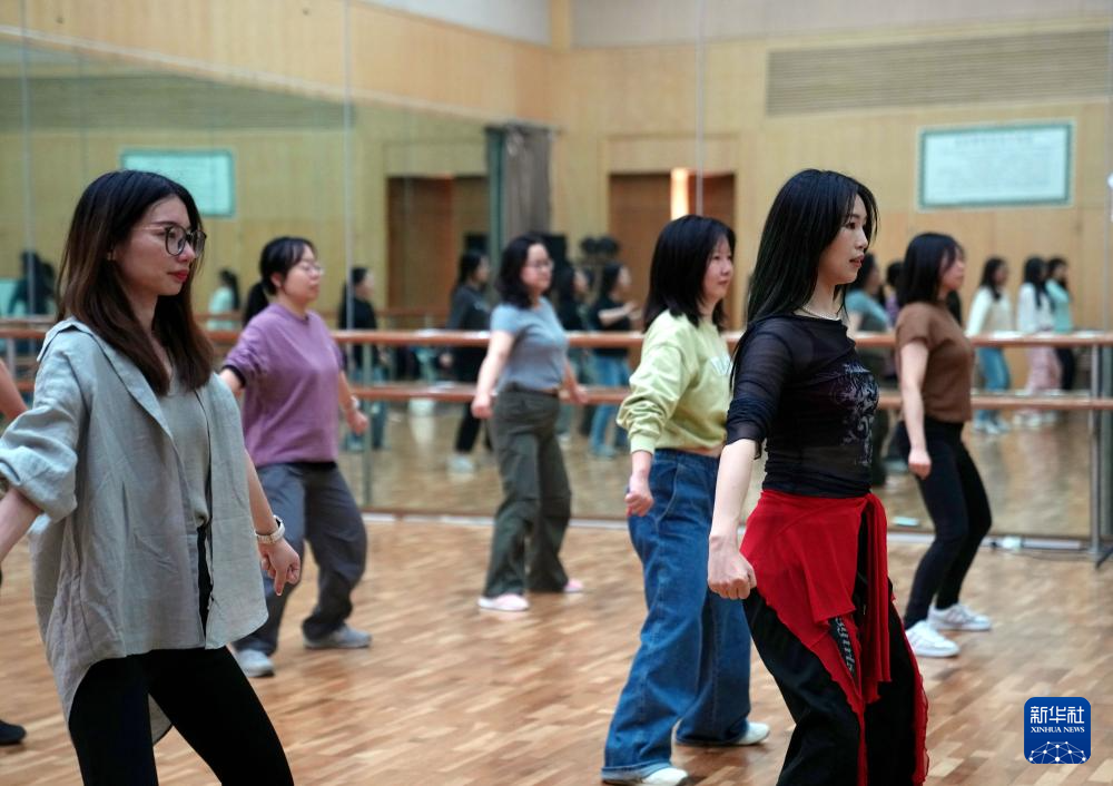 4月7日晚,在上海市群眾藝術館,爵士舞課程的學員們在上課。