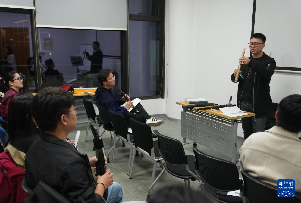 4月7日晚,在上海市群眾藝術館,電吹管課程的老師在授課。