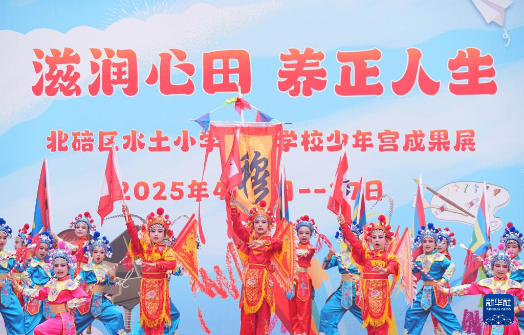 4月9日,在重慶市北碚區水土小學“滋潤心田 養正人生”鄉村學校少年宮成果展現場,孩子們在表演川劇《穆桂英》。