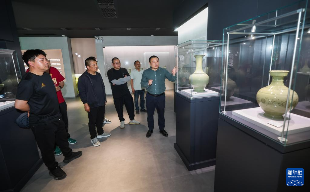 4月9日,在施山社區施家山公共文化空間的越窯青瓷施珍藝術館內,文化特派員應周挺(右一)在給參觀者介紹青瓷作品。