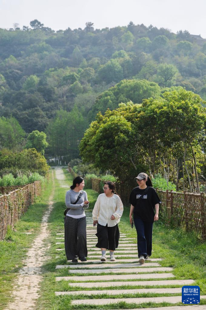 4月9日,游客在施山社區施家山公共文化空間的口袋公園內散步。這個口袋公園依托菜園旁的閑置地塊改造而成。