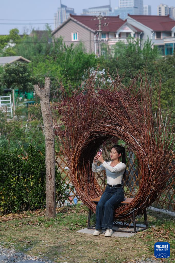 4月9日,游客在施山社區施家山公共文化空間的口袋公園內拍照留影。這個口袋公園依托菜園旁的閑置地塊改造而成。