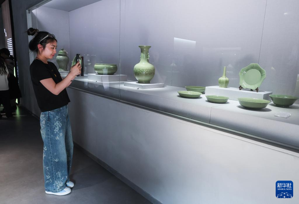 4月9日,游客在施山社區施家山公共文化空間的越窯青瓷施珍藝術館內參觀拍照。