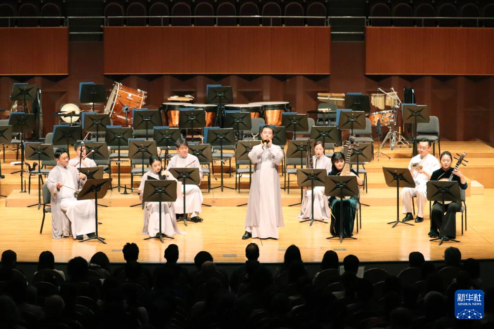 4月8日,在日本大阪交響音樂廳,日本世紀交響樂團和南京民族樂團演奏交響樂曲《詩意江南》。新華社記者 楊光 攝