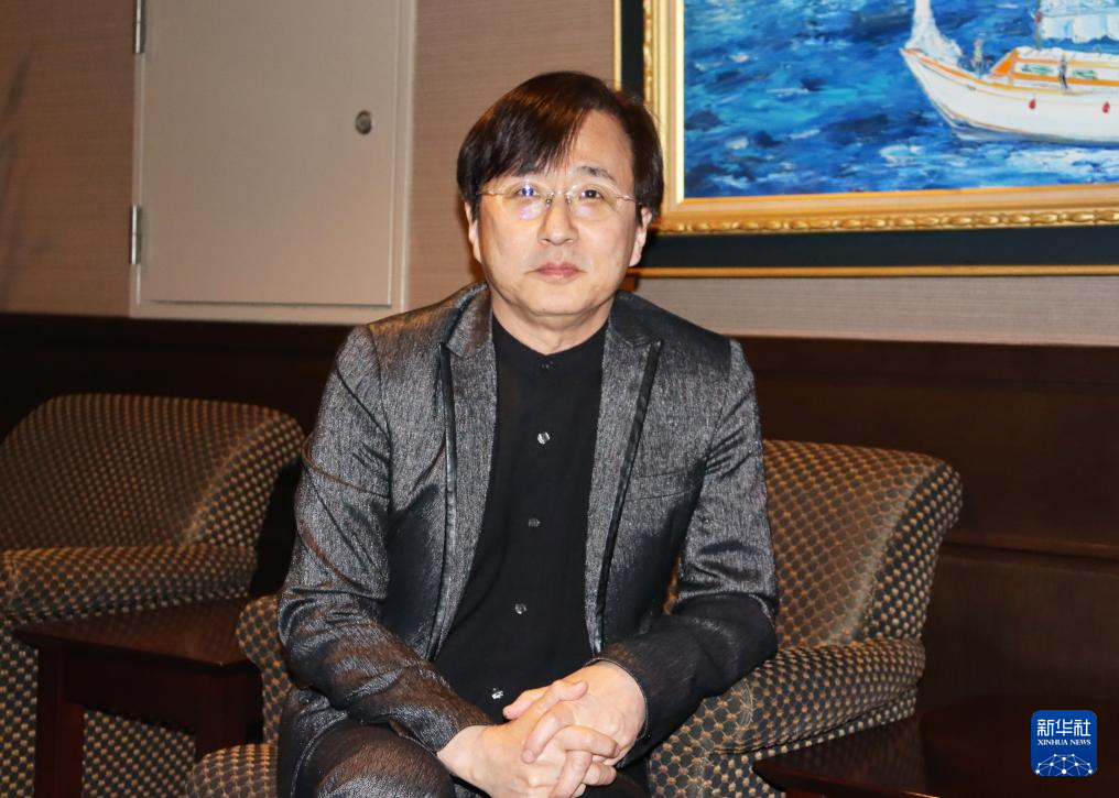 4月8日,日本指揮家飯森范親在大阪交響音樂廳接受記者采訪。新華社記者 楊光 攝