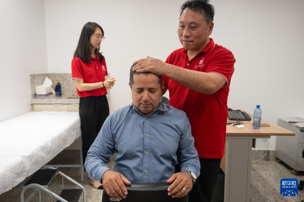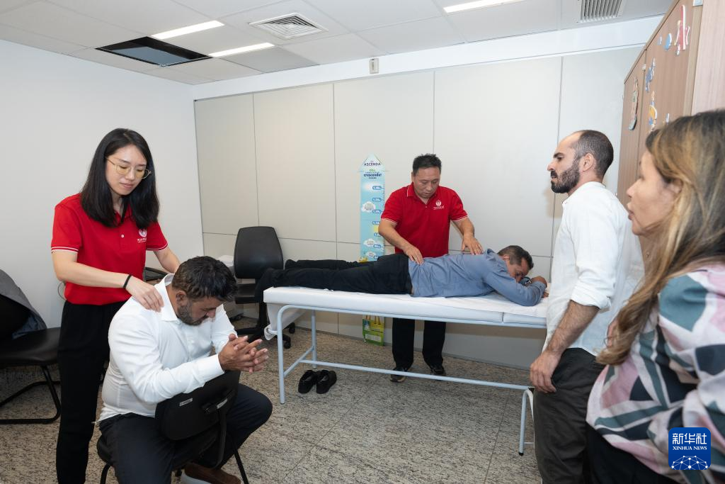 4月9日,在巴西戈亞斯州首府戈亞尼亞,中醫孔子學院的老師為一名體驗者進行推拿。