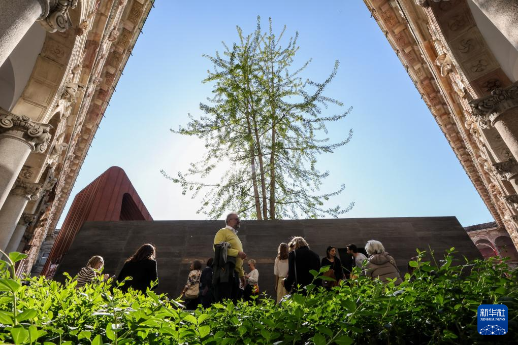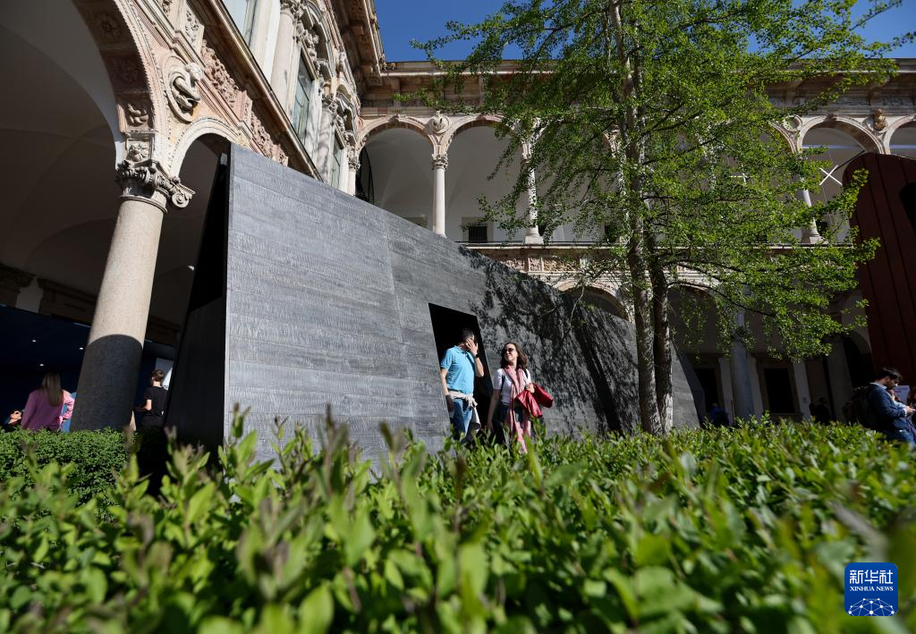 4月11日,在意大利米蘭國立大學,人們參觀中國設計師吳濱的設計作品《杳然庭》。