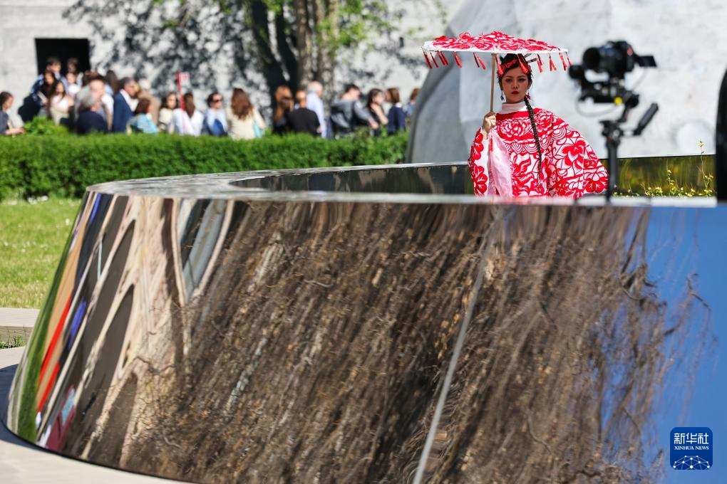 4月11日,在意大利米蘭國立大學,演員在中國設計師陳耀光的鏡面裝置作品《禮物》中表演。