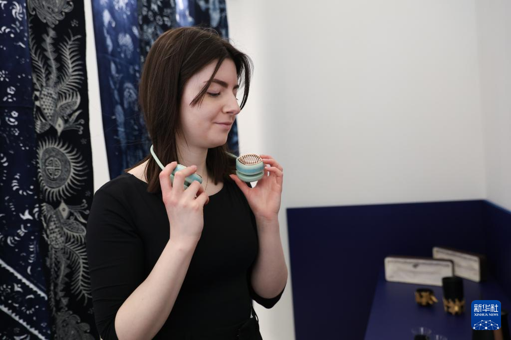 4月13日,在意大利米蘭設計周的貴州工業設計城展區,工作人員展示一款掛脖風扇。