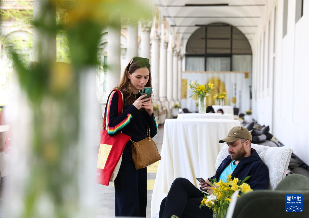 4月12日,在意大利米蘭國立大學,人們在顧家家居展區參觀體驗。
