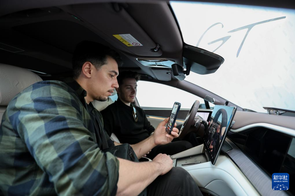 4月11日,在意大利米蘭,參觀者體驗比亞迪旗下中國汽車品牌騰勢推出的智能豪華旗艦車型Z9GT。