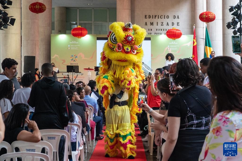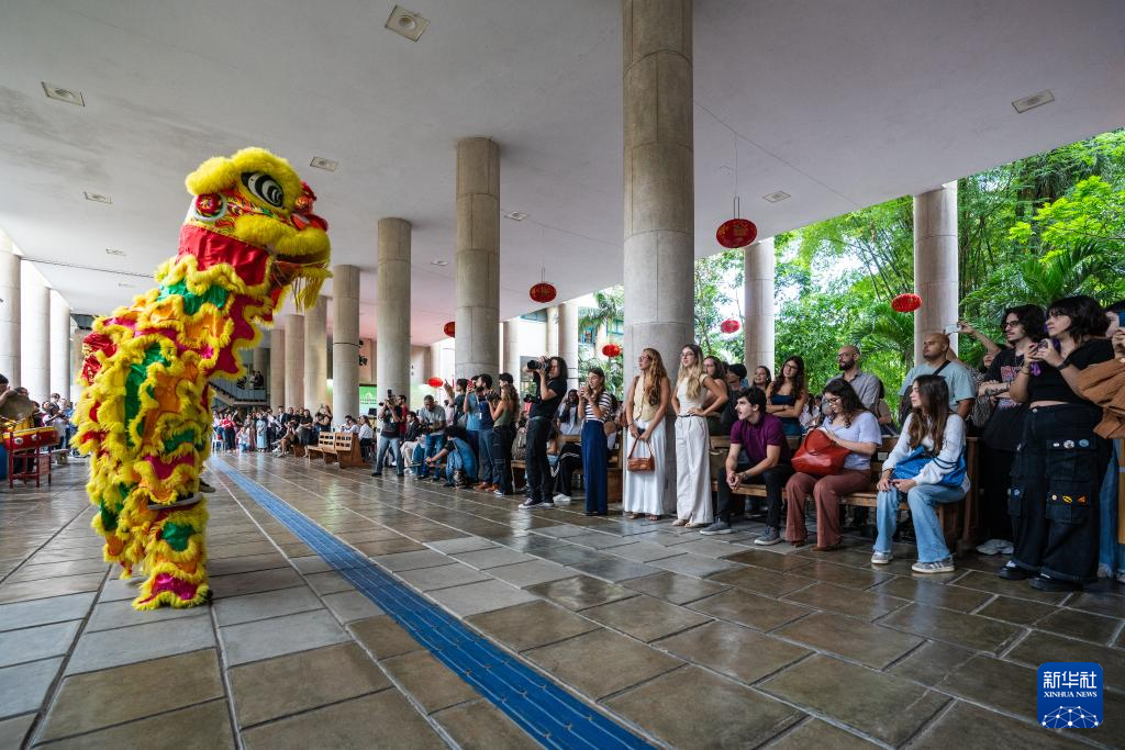 4月15日,在巴西里約熱內盧天主教大學舉辦的“國際中文日”慶?;顒由?,人們觀看舞獅表演。