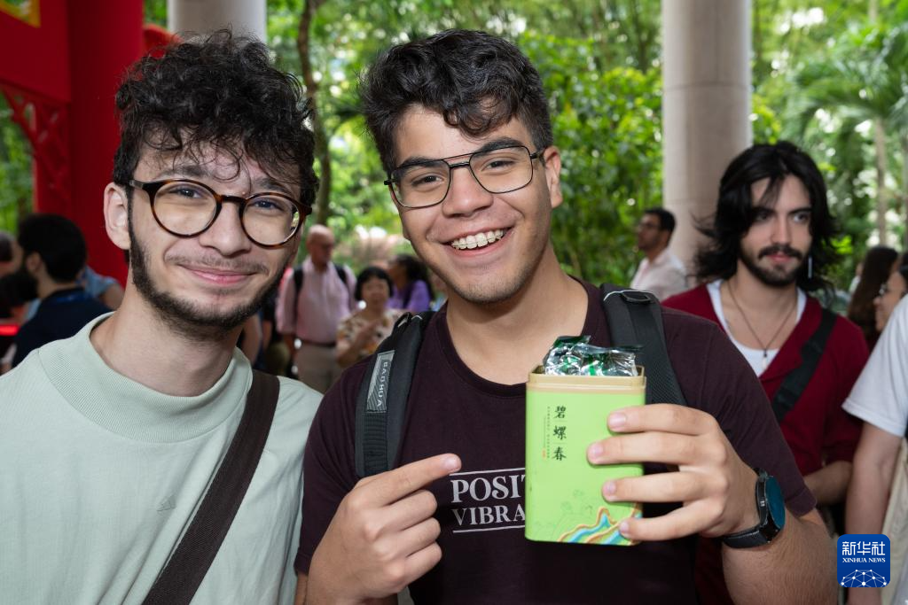 4月15日,在巴西里約熱內盧天主教大學舉辦的“國際中文日”慶?;顒由?,兩名學生稱贊中國茶葉。