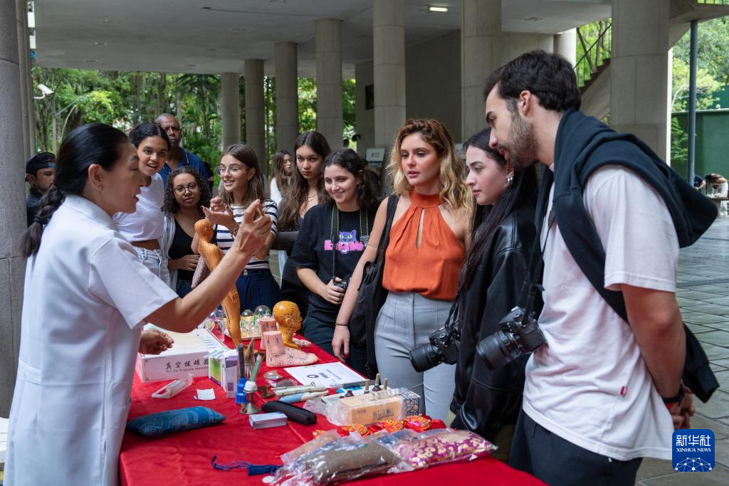 4月15日,在巴西里約熱內盧天主教大學舉辦的“國際中文日”慶?;顒由?,學生們觀看中醫療法展示。