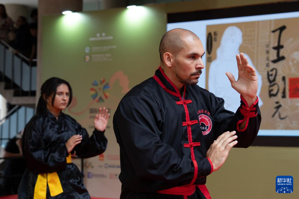 4月15日,在巴西里約熱內盧天主教大學舉辦的“國際中文日”慶?;顒由?,武術愛好者進行中國傳統武術展示。