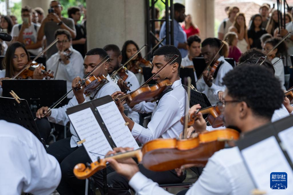 4月15日,在巴西里約熱內盧天主教大學舉辦的“國際中文日”慶?;顒由?,里約熱內盧青年交響樂團演奏樂曲。