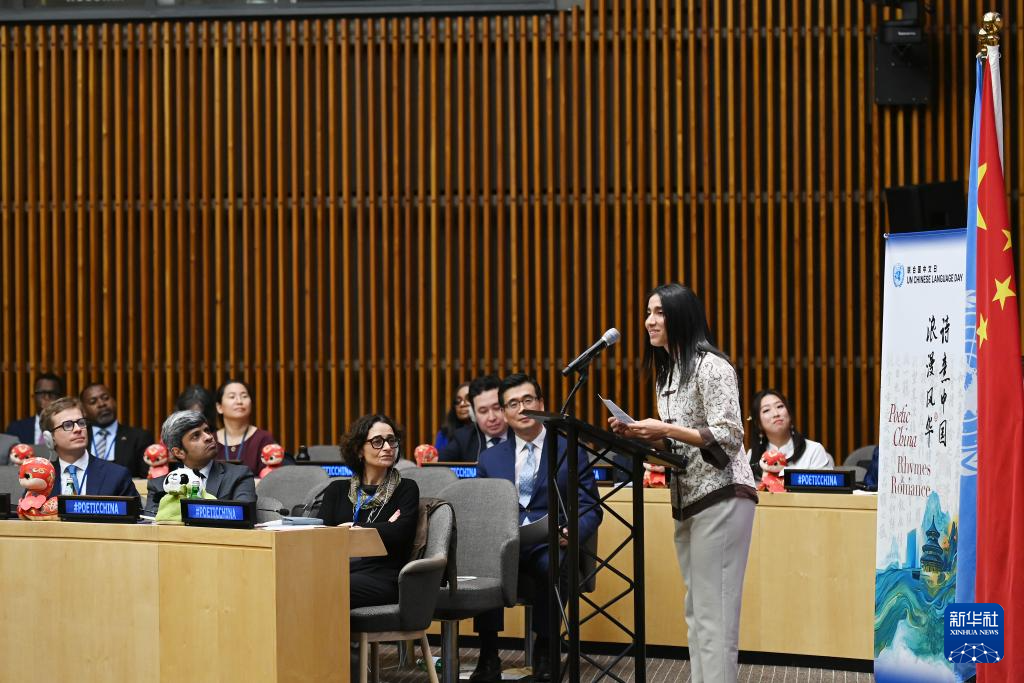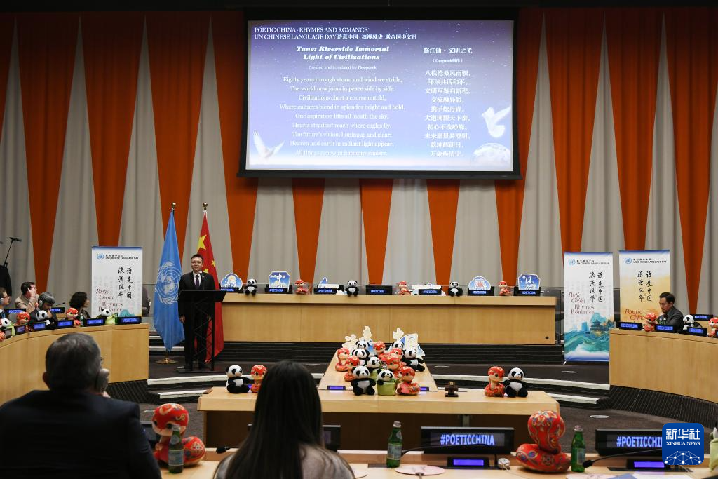 4月15日,在位于紐約的聯合國總部,中國常駐聯合國代表團青年外交官在2025年聯合國中文日活動上朗誦由深度求索(DeepSeek)生成的《臨江仙·文明之光》。