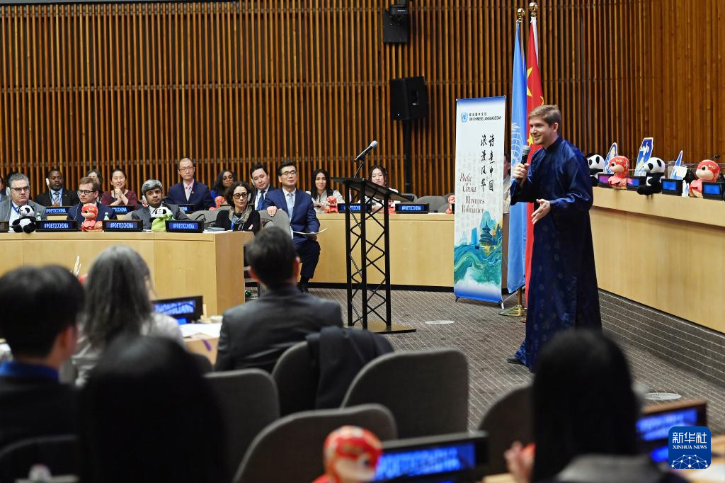 4月15日,在位于紐約的聯合國總部,來自聯合國全球傳播部的美國青年扎克·丹茨在2025年聯合國中文日活動上朗誦《周易》片段。