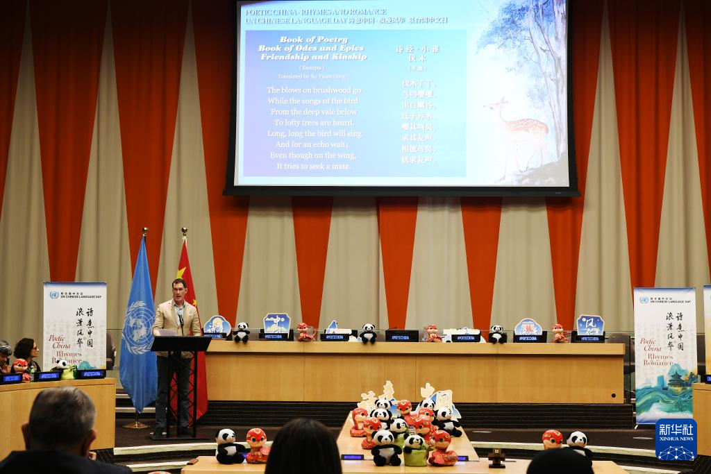 4月15日,在位于紐約的聯合國總部,聯合國全球傳播部職員在2025年聯合國中文日活動上朗誦《詩經·小雅》片段。