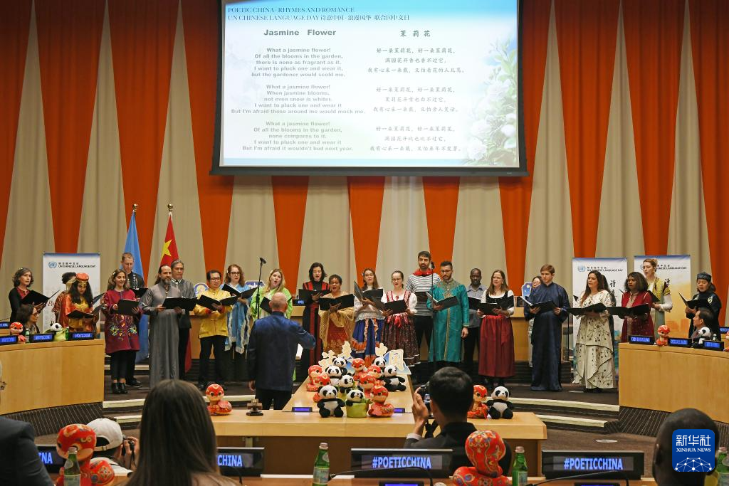 4月15日,在位于紐約的聯合國總部,聯合國合唱團成員在2025年聯合國中文日活動上演唱中國民歌《茉莉花》。