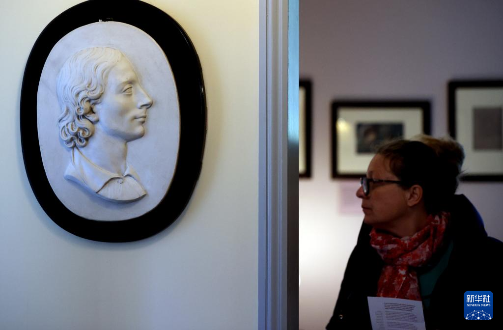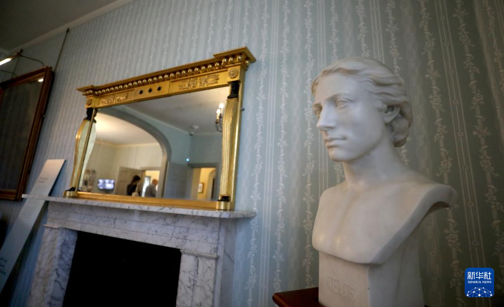 這是4月16日在英國倫敦濟慈故居內拍攝的濟慈雕像。