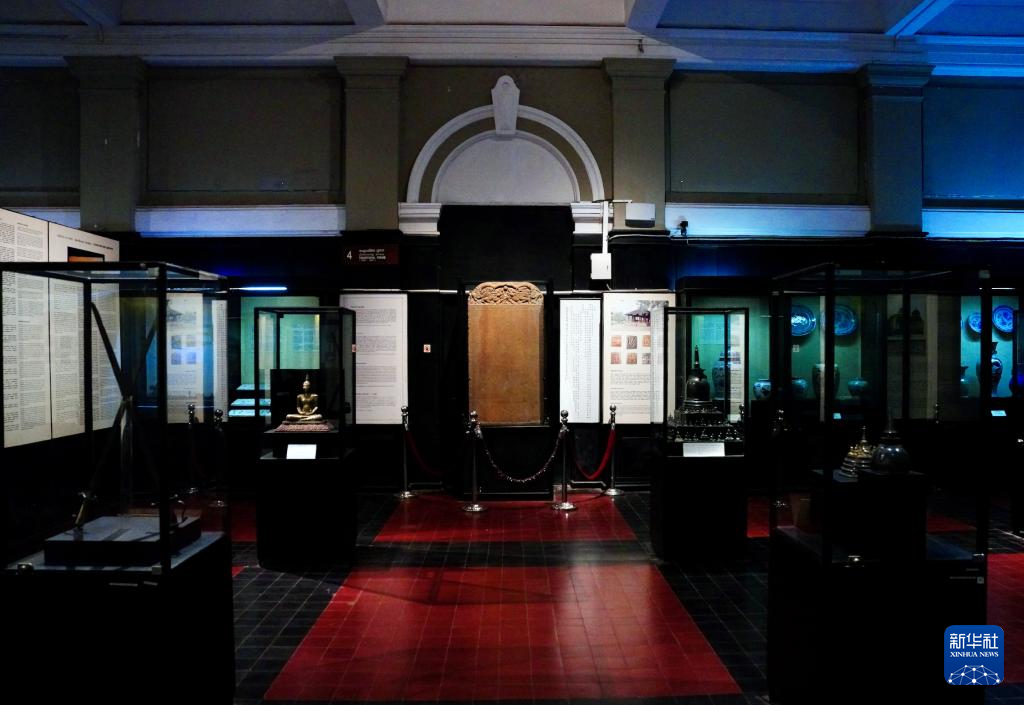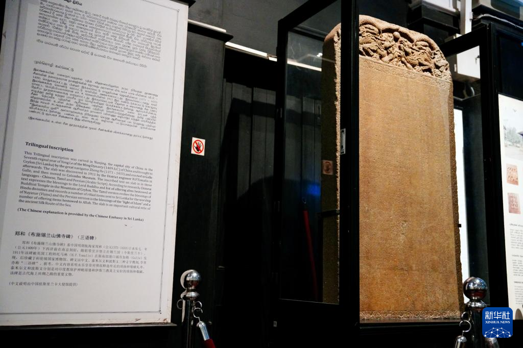 4月17日,鄭和遺存《布施錫蘭山佛寺碑》(中)在斯里蘭卡科倫坡國家博物館主展廳展出。