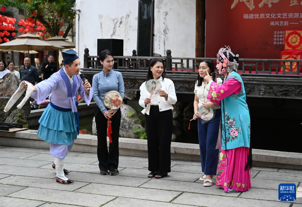 4月6日,福州閩劇藝術傳承發展中心演員與游客在福州上下杭歷史文化街區開展浸入式互動演出。