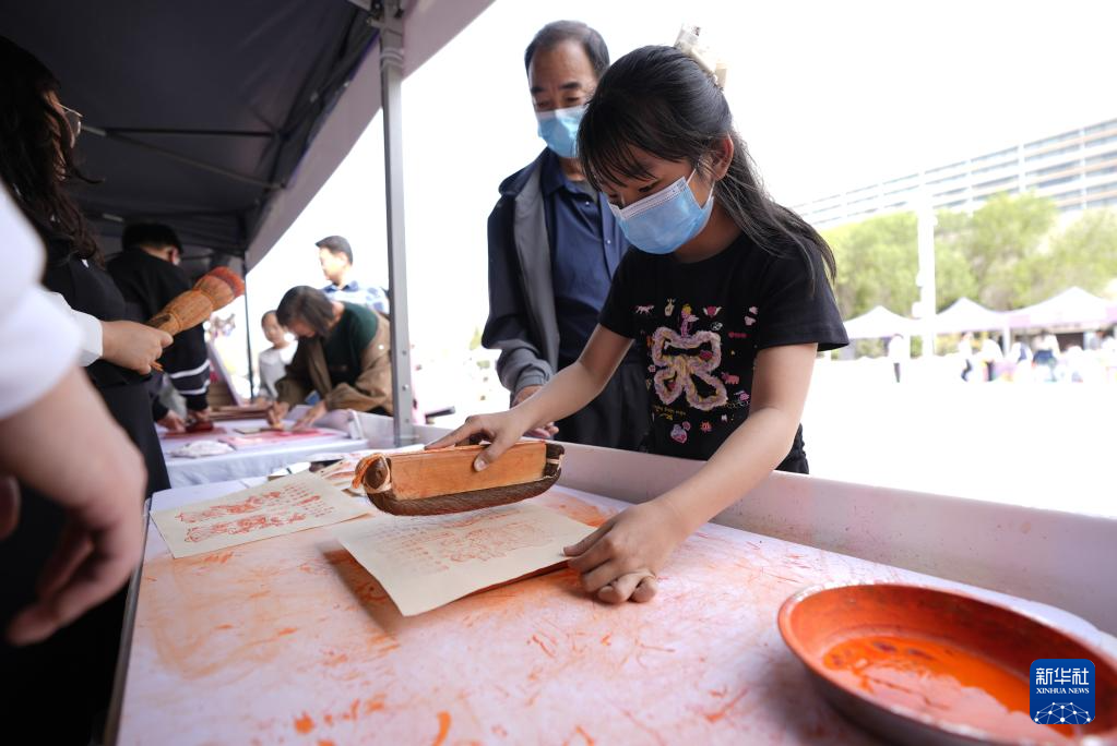 4月20日,市民在活動現場體驗雕版印刷。