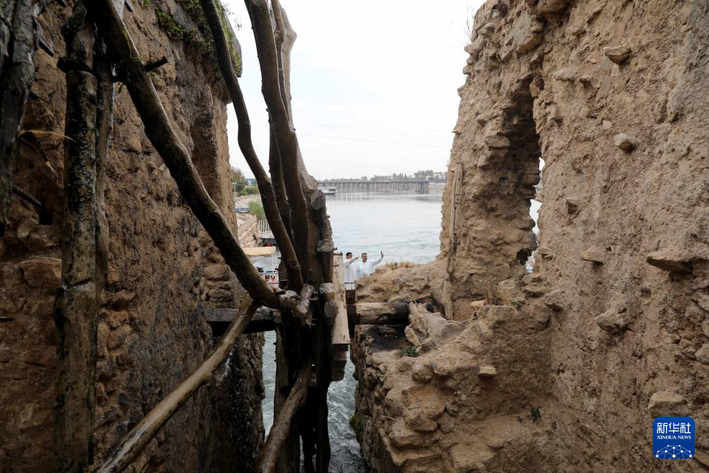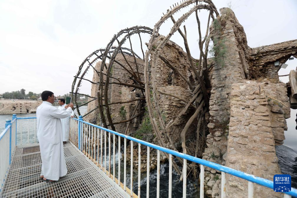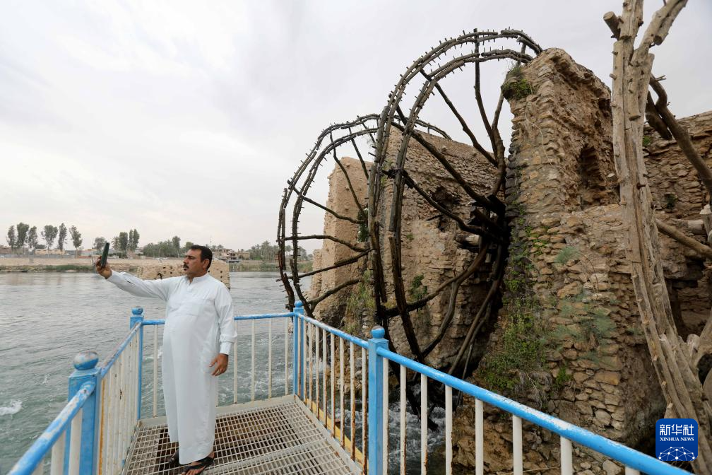 4月21日,人們在伊拉克安巴爾省參觀幼發拉底河上的傳統水車。