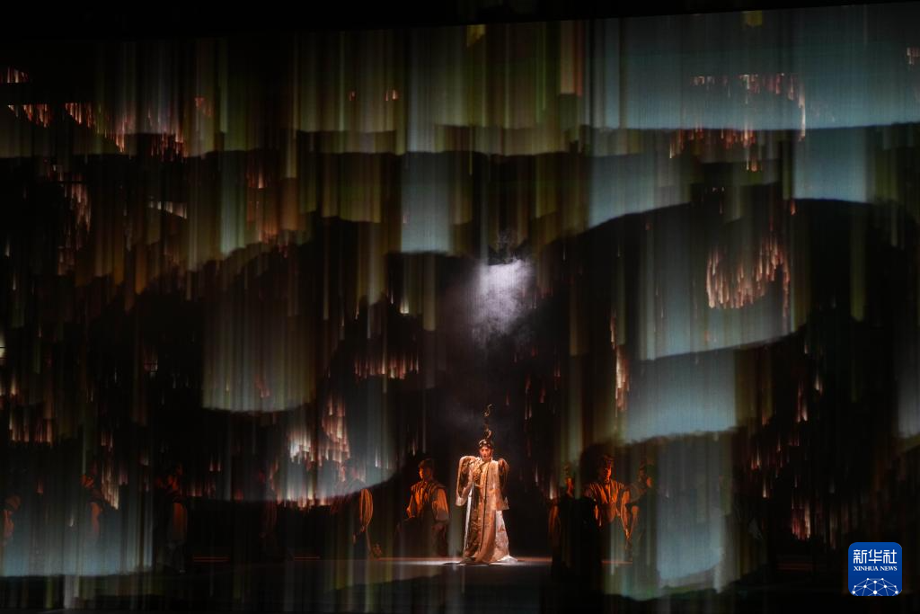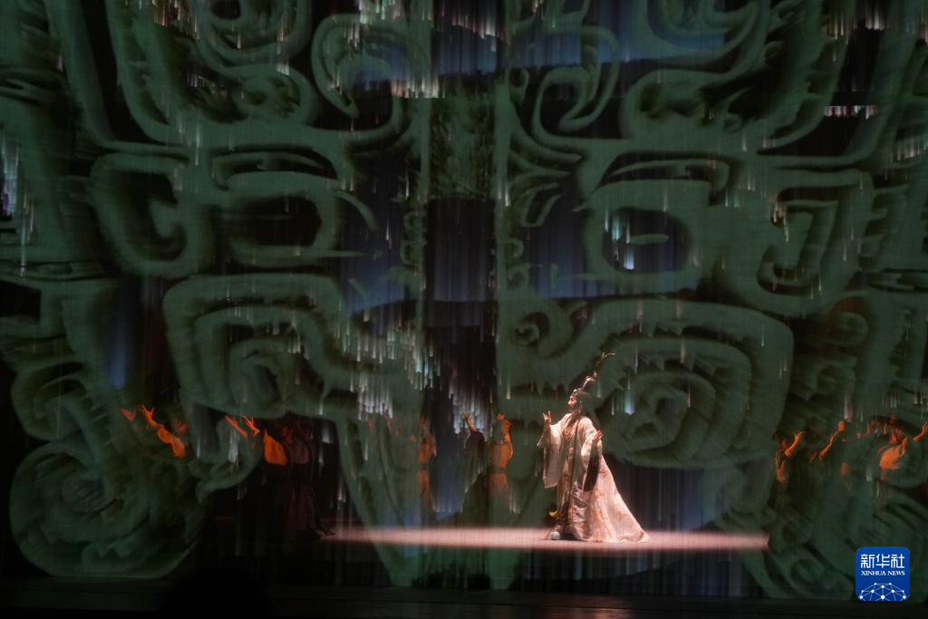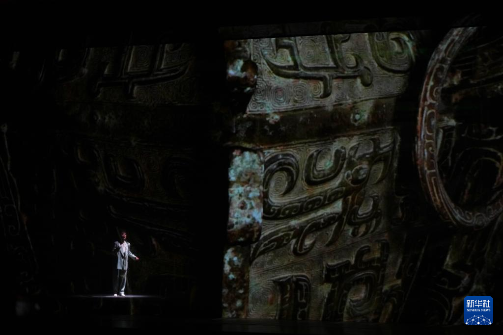 4月23日,演員在湖南大劇院演出新編京劇《皿方罍》,皿方罍的部分紋飾被投影在紗幕上。